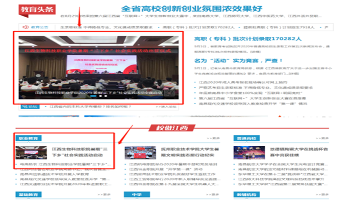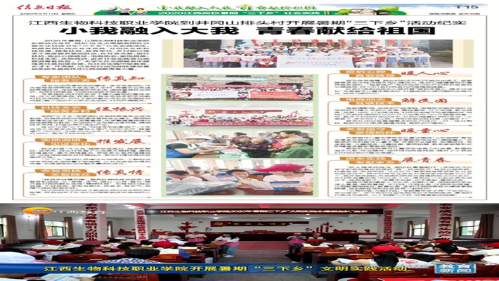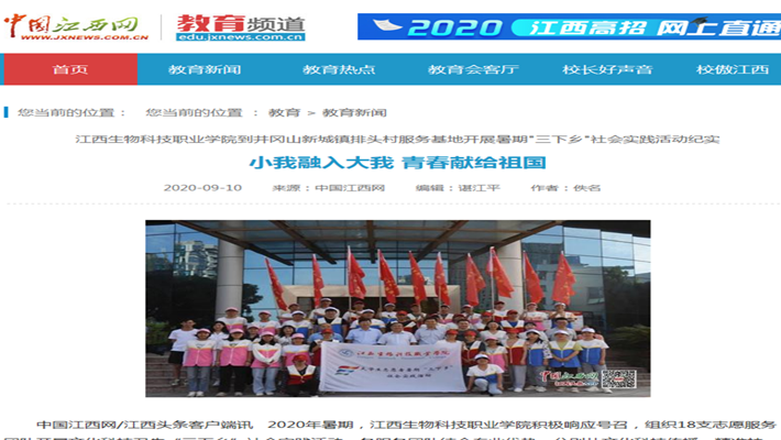 暑假期间,学院组织学生深入基层,服务基层,江西农业频道、江西教育电视台、大江网、江西头条、教育头条、手机江西网等各大媒体争相报道,受到服务地和社会各界一致好评!