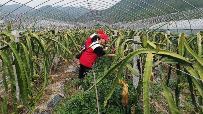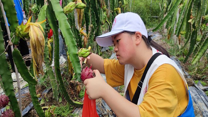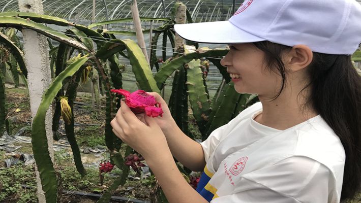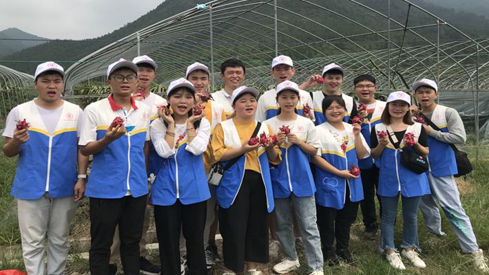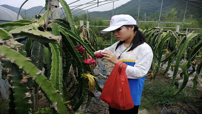 为进一步了解排头村农产品的产出及包装程序,确保直播带货商品的质量,志愿服务团全体成员和学院驻村博士来到火龙果、黄桃基地,进行实地走访。志愿者们和当地村民一起下地,在火龙果基地分工采摘,参与挑果、选果、试吃、打包等流程,把果子按照大小分为大果、中果、小果三类,标注好不同价格。并全程拍摄照片、录制视频,精心设计一系列精美宣传海报,在朋友圈、微博、班级群等广泛宣传,为直播做好预热。