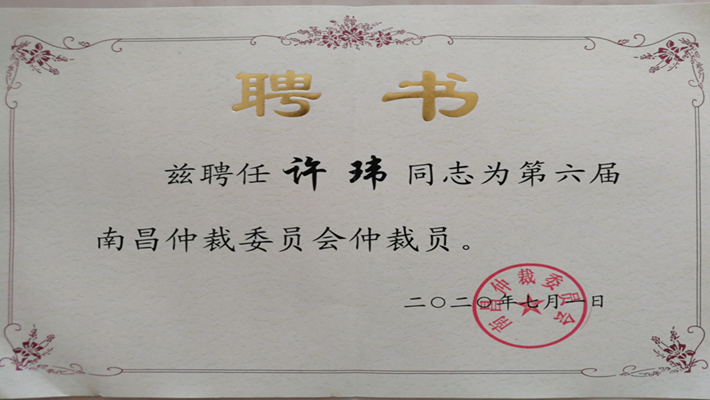 祝贺园林工程系教师许玮当选第六届南昌仲裁委员会仲裁员