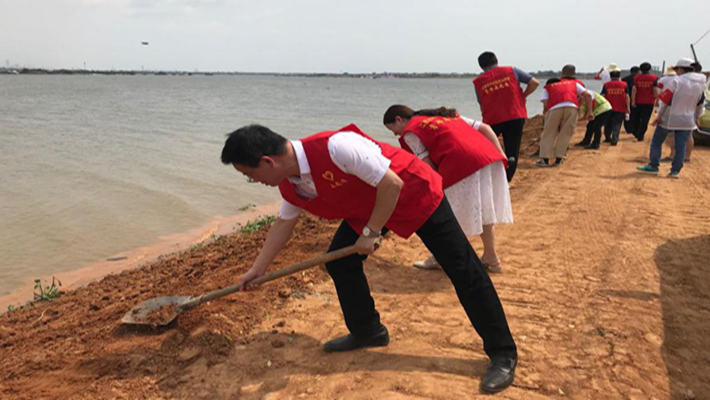 上午,思政部支部的党员同志来到南昌县八一乡黛洲路水毁公路修复加固工程路段,到了抗洪一线,同志们迅速加入到抗洪队伍当中,忙着运沙石、搬沙袋,铲土护坡,干得热火朝天,虽天气炎热,但丝毫没有减弱同志们的抗洪热情。在短暂的休息过程中,侯昌芹副院长向受灾群众询问汛情,了解他们目前的生活状况,并向受灾群众进行了慰问。