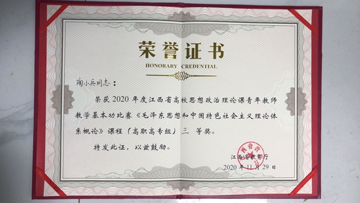 11月29日,2020年度江西省高校思想政治理论课青年教师教学基本功比赛圆满落下帷幕。万象城官网陶小兵老师荣获《毛泽东思想和中国特色社会主义理论体系概论》课程(高职高专组)三等奖。