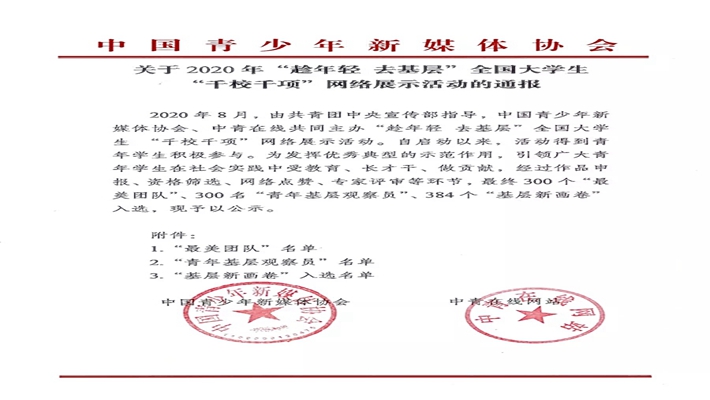 喜讯:万象城官网荣获2020年全国大学生“千校千岗”网络展示活动“最美团队”“青年基层观察员”称号