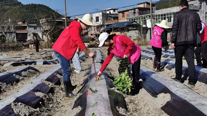 近日,来自江西会昌2019级畜牧兽医扩招2班的张丽萍、池方贵、李森林、许平东四位同学了解到当地有一位农民身体不适,家中十亩地无人照理,便积极组织当地志愿者伙伴,前往农户家中帮助干农活。志愿者们挥锹挖土、放苗扶正、填土压实、施肥浇水,田间地头一片繁忙景象。