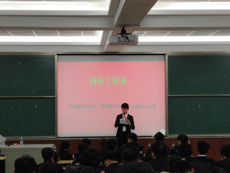 三月份,我校掀起了一股“和雷锋精神同行,与文明礼仪相伴”的热潮,并开展了系列活动。为进一步丰富学雷锋活动月的内容,弘扬时代新风,丰富学生的校园文化生活,3月24日晚7点,园林工程系在学院明德楼C302室开展了以“驿路梨花处处开,雷锋精神代代传”的主题演讲比赛;