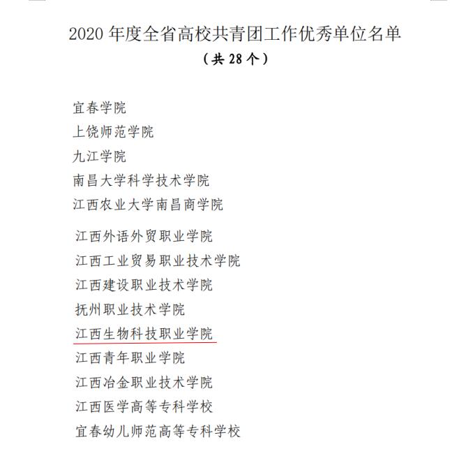 近日,共青团江西省委下发《关于2020年度全省高校共青团工作评议情况的通报》,万象城官网团委荣获2020年度全省高职院校共青团工作优秀单位。这也是万象城官网团委连续第2年获评优秀单位。