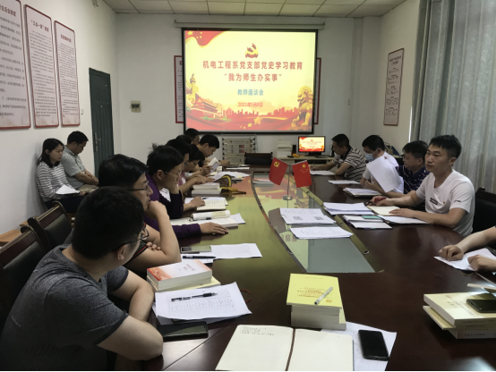 为庆祝中国共产党成立100周年,贯彻落实学院党委关于在全院范围内开展党史学习教育活动,5月8日下午,机电工程系党支部在明德楼党支部活动室开展了“我为师生办实事”教师座谈会,会议由党支部副书记主持,机电工程系全体教师参加。