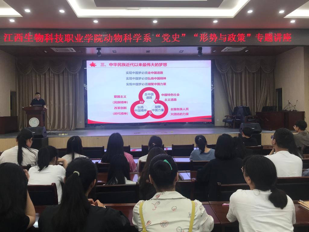 为深入推进党史学习教育,扎实开展习近平新时代中国特色社会主义思想和党史专题学习培训,5月11日,动物科学系在知行楼多功能会室开展了“ 以中国梦擘画复兴蓝图”为主题的党史、形势政策专题讲座。