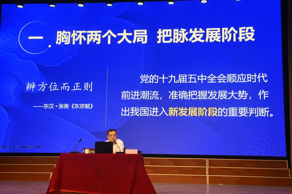 王义林从党的十九届五中全会的召开引入本次课程,回顾过去,立足当今,展望未来,从“胸怀两个大局,把脉发展阶段”、“肩负历史使命,擘画宏伟蓝图”、“保持战略定力,勠力同心前行”三个方面为同学们进行了生动的讲解。