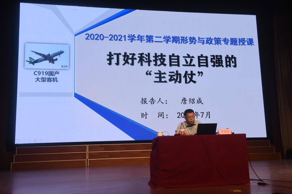 学院党委委员、副院长詹绍成紧接着作了“打好科技自立自强的主动仗”的专题授课。詹绍成从格局重构竞争加速、把握机遇应对挑战、深化改革自立自强三个方面讲述了我国科技发展的现状及未来展望,同时通过图片、视频的展示,向同学们展示了我国科技事业的重大成果,使大家深刻感受到中国要强盛、要复兴,就一定要大力发展科学技术,努力成为世界主要科学中心和创新高地。