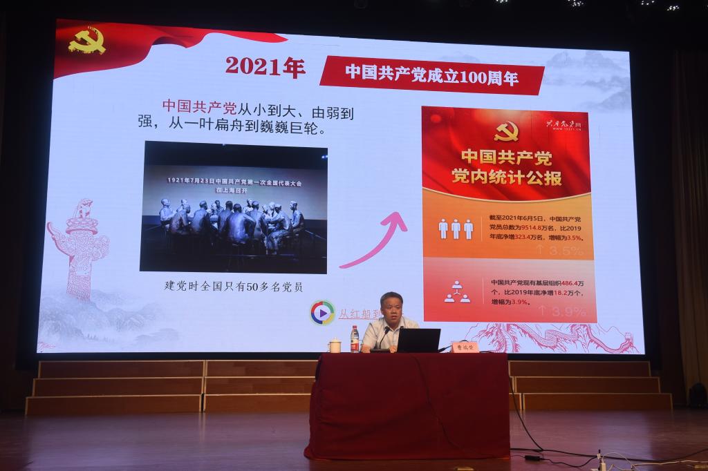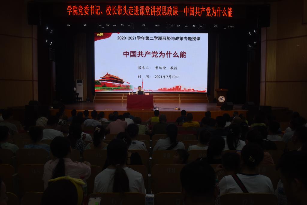 曹端荣紧紧围绕“中国共产党为什么能”这一主题,从科学的理论指导、坚定的理想信念、强大的组织优势、坚实的群众基础、彻底的自我革命等五个方面,用大量精准的数据、详实的案例进行了深入而细致的解读,并勉励同学们要坚定中国共产党历史自信,坚定中国人民和中华民族未来自信,做到学史明理、学史增信、学史崇德、学史力行,以昂扬姿态奋力开启全面建设社会主义现代化国家新征程。