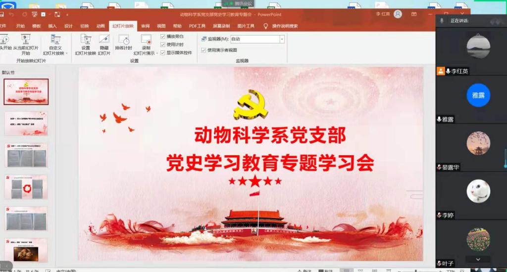 7月21日下午,动物科学系党支部通过腾讯会议开展了线上党史学习教育集中学习会。学院党委委员、纪委书记刘晓凌、支部党员干部及流动党员参加本次学习会。