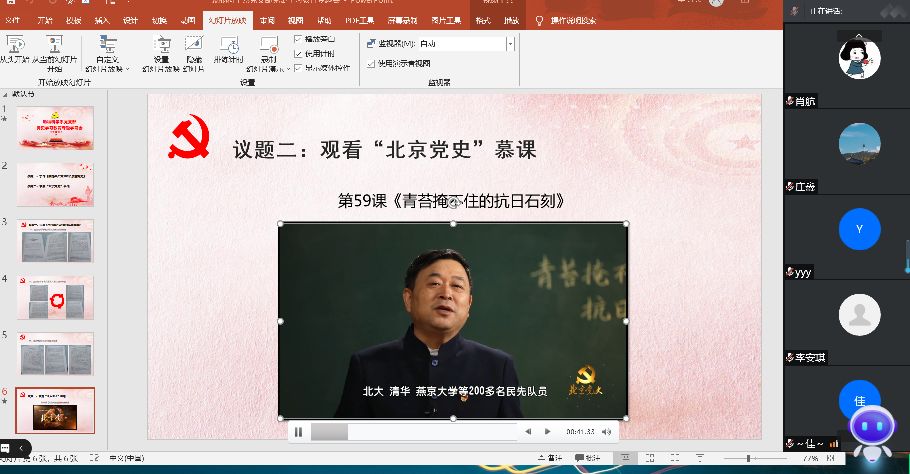 会上,支部宣传委员为全体党员诵读及细心的讲解了《中国共产党100年江西简史》“第一章中共江西地方组织的建立和大革命洪流”的内容,随后集中观看了“北京党史”慕课第59课《青苔掩不住的抗日石刻》。