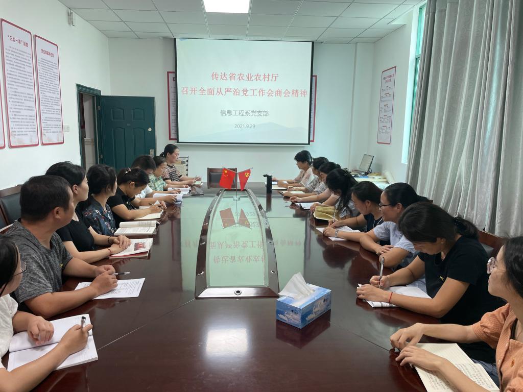 9月29日下午,信息工程系党支部组织全体党员在党员活动室召开了全面从严治党专题学习会,会议由党支部书记主持。
