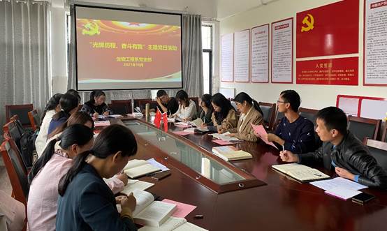 10月29日,生物工程系党支部组织开展“光辉历程,奋斗有我”主题党日活动。全体在家党员参加了此次活动,活动由支部书记主持。