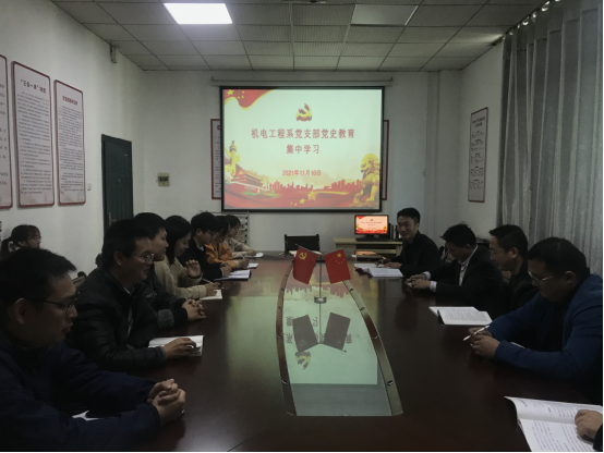 根据学院党史学习教育工作安排,11月10日下午,机电系党支部集中组织学习了习近平总书记在中共中央政治局第三十四次集体学习时的重要讲话精神、省委常委会(扩大)会议精神;易炼红《在省委党史学习教育领导小组第七次会议上的讲话》;叶建春《在全省党史学习教育工作推进会上的讲话》;易炼红同志在推进文化强省推进大会上的讲话精神等;并研究贯彻落实意见,进行了学习交流研讨。该系党支部全体党员及教师参加会议。